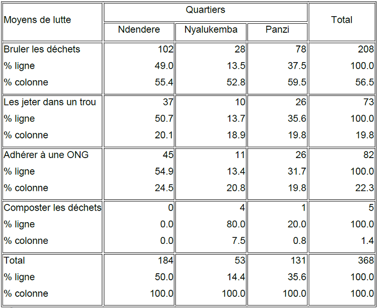 Tableau 15 : Moyens de lutte contre les dangers des déchets et nombre et pourcentage des enquêtés ayant connu ces moyens dans les quartiers étudiés