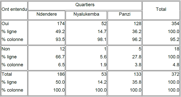 La majorité de nos enquêtés (95.2%) a entendu parler de la gestion des déchets. Les enquêtés ayant entendus et d’autres qui n’ont jamais entendu parlés de la gestion de déchets sont repris dans le tableau ci-dessous :