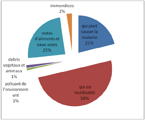 Il ressort de cette figure que la moitié des enquêtés définit le déchet comme étant tout ce qui est inutilisable. L’autre moitié ne connait pas la définition d’un déchet. Elle le définit comme étant les restes d’aliments et les eaux usées alors que la tranche restante définit le déchet comme étant toute substance qui peut causer une maladie. Ces différentes données au terme déchets par la population de la commune d’Ibanda pourraient s’expliquer par les sources d’information de la population, le niveau d’études des sensibilisateurs, et le niveau d’instruction de la population.