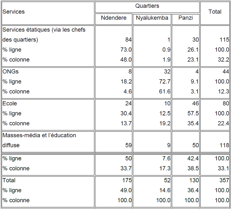 Ce tableau montre que les services qui sensibilisent la population sur la gestion des DM sont au nombre de quatre (services étatiques, ONGs, école et masses-média) et les personnes sensibilisées varient hautement des quartiers (α=0,0000 ≤ 0,01). En effet, les quartiers situés dans le centre ville et qui hébergent les ménages abonnés aux ONGs chargés du ramassage des déchets sont sensibilisés par ces derniers c’est le cas du quartier Nyalukemba. Cependant, les quartiers éloignés du centre ville, habités par les ménages généralement pauvres, bénéficient de la formation sur la gestion des déchets par les services étatiques à travers leurs chefs de quartiers qui sont parfois non instruits. C’est le cas des quartiers Panzi et Ndendere. Au Ghana, Thompson (2010) a montré que les services chargés de sensibiliser la population sur la gestion des DM existent et 80% de ces services sont organisés par le secteur privé à travers les ONGs. A Bujumbura, les services chargés de sensibiliser la population sur la gestion des DM existent. Cette sensibilisation se fait à travers les services étatiques et privés qui travaillent sous le contrôle de la Direction Générale de l’Aménagement du Territoire, de l’Environnement et du Tourisme (DGATET) (Citeretse, 2008). Les résultats obtenus pendant la recherche peuvent être comparé à ceux des auteurs ci-dessus. Selon ces auteurs, les ONGs et les services étatiques sont impliqués dans la sensibilisation de la population sur la gestion des déchets dans leurs pays respectifs. Cependant, les écoles et masses-média impliqués dans la sensibilisation de la population sur la gestion des déchets dans la commune d’Ibanda ne sont pas concernés par la sensibilisation sur la gestion des déchets dans leurs aires de recherche.