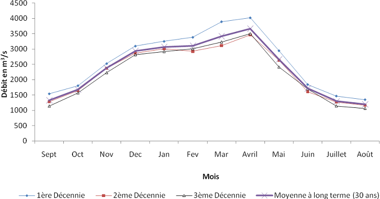 Il est aussi à remarquer que pour la moyenne mensuelle des débits sur une période de 30 ans restent inferieure à la moyenne des débits sur la première décennie, mais supérieure aux moyennes de deux autres décennies.