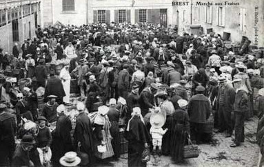 Ainsi, les femmes gardaient leur costume originel lorsqu’elles venaient à Brest. Ces femmes, originaires du Léon ou de l’Aven, ne se rendaient pas à Brest en emportant uniquement leur costume dans leur bagage. Elles emportaient – et apportaient à Brest – leur culture, leurs habitudes et leur langage. Une femme originaire du pays Fouesnantais – portant le costume de surcroît – utilisait inévitablement la langue bretonne. De plus, nous pouvons affirmer que la domesticité était majoritairement bretonne au regard de ces documents photographiques puisque nous voyons qu’elles sont très représentées sur les cartes postales représentant les marchés, non seulement du côté des commerçants mais aussi du côté de la clientèle, assurant l’intendance de la maison dans laquelle elles étaient employées.