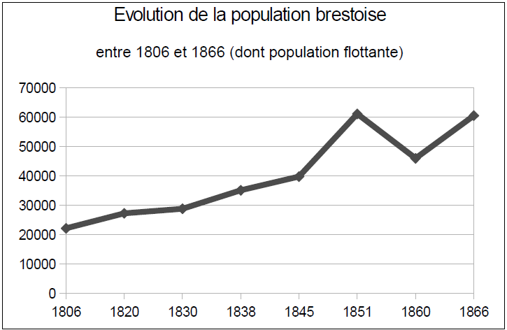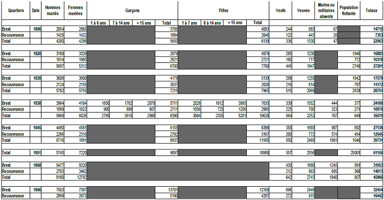 Souhaitant savoir quelle était l’évolution démographique de la ville de Brest, j’ai effectué, à partir des chiffres du recensement de la population qui étaient à ma disposition, un tableau récapitulatif (sondage entre 1806 et 1866). Certains chiffres sont erronés et je les ai retranscrits volontairement tels qu’ils étaient car ils ne représentent pas de différences significatives. Le dénombrement de la population se traduit par le nombre de femmes et d’hommes mariés, le nombre de garçons et de filles (dont les non mariés), quelquefois par tranche d’âge, le nombre de veufs et veuves, le nombre de marins ou militaires absents et la population flottante(125). Les recensements ne fournissent pas l’ensemble de ces détails à chaque fois. Celui de 1860, par exemple, ne possède pas de données concernant le nombre de garçons ou filles. Nous constatons que la population de Brest est en constante augmentation tout au long du XIXe siècle (le calcul du total est retranscrit tel quel) :