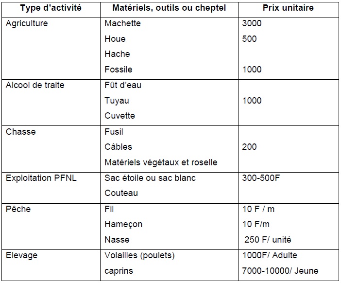 3.1.11 Les moyens de production admin 13 ans ago Les différents moyens de production utilisés sont listés dans le tableau IX. Tableau 9 : Relevé des moyens de production par activité Les moyens de production utilisés relèvent des habitudes de leurs parents Page suivante : 3.1.12 Appréciation du rôle des flux culturels et des différentes connaissances endogènesRetour au menu : Etude de la contribution des ressources naturelles aux budgets des ménages ruraux : Cas du village BANGA (République Centrafricaine)