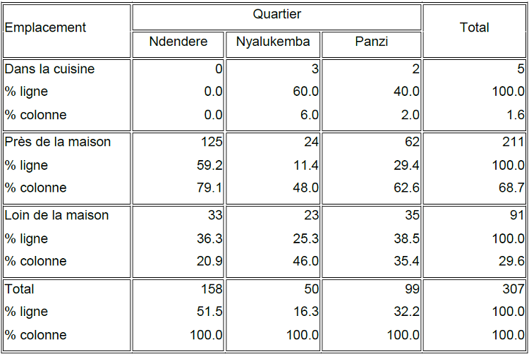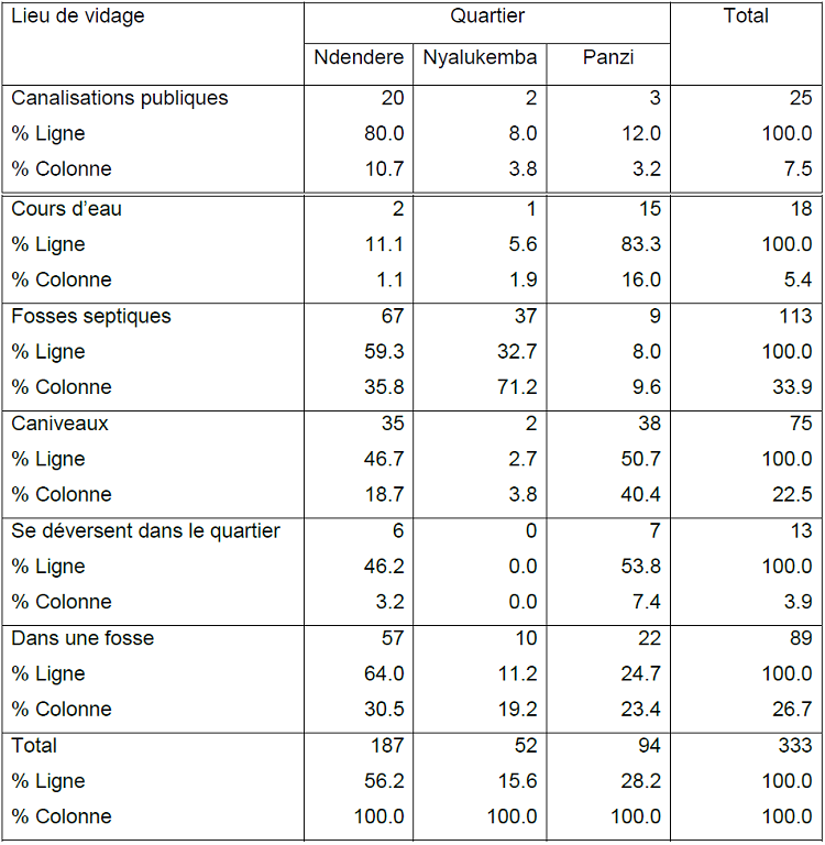Ce tableau montre que le lieu de décharge des eaux provenant des latrines dépend hautement des quartiers (α=0,0000 ≤ 0,01). A Ndendere, ces eaux vont dans les fosses septiques (35,8%) ou dans une fosse simple (30,5%), à Nyalukemba, ils vont dans les fosses septiques (71,2%) alors qu’à Panzi ils vont dans les caniveaux (40,4%), dans des fosses (23%) ou dans les cours d’eau (16%). Ceci serait due au niveau de vie et d’information de la population sur la gestion des déchets ménagers Ces résultats pourrait être comparé à ceux trouvés dans nombreux pays en développement: Thompson (2010), a montré qu’au Ghana nombreux ménages ne disposent des latrines. Les quelques latrines qui existent sont mal aménagés, ils ouvrent dans les caniveaux, les rivières etc. Seul le contenu de quelques latrines est collecte par un service de ramassage des déchets. Au Congo, SANA Congo (2010) a montré que dans certaines villes, la municipalité et certaines organisations privées disposent des véhicules qui collectent les boues de vidanges des installations sanitaires qu’ils déversent, sans traitement, dans des excavations situées hors du périmètre urbain. Le secteur privé utilise aussi une autre forme de vidange qui consiste à transférer le contenu des fosses ou latrines dans un trou préalablement creusé dans la rue ou dans la parcelle laissé ouvert à l’air. D’autres ménages attendent le moment des fortes pluies pour vider les fosses dans la rue ou dans les canalisations des réseaux d’eaux pluviales pour que les excrétas soient emportés par les eaux de pluies qui ruissèlent et stagnent dans le voisinage. A Kigali au Rwanda, MINITERE (2002) a montré que 42,5% d’habitants sont connectés à un système de vidange des latrines. La population qui ne bénéficie pas de cette facilitation, laisse les matières fécales dans les fosses septiques ou les vident dans une fosse préalablement préparés dans les parcelles.