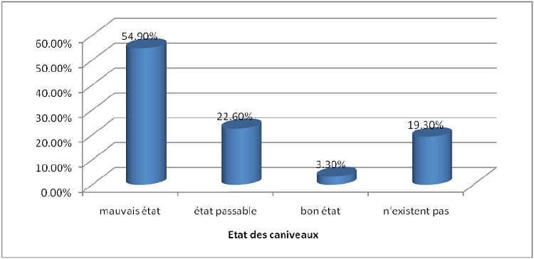Il ressort de ce tableau que l’état des caniveaux dépend hautement des quartiers (α=0,0000 ≤ 0,01). En effet, les parties de la ville construite pendant la colonisation dispose des caniveaux vétustes en mauvais état. Cependant, les quartiers nouvellement habités n’en ont pas du tout. La figure 4 montre que les caniveaux en mauvais état sont plus nombreux (54.9%).