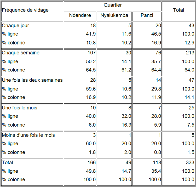 Ce tableau montre que la fréquence de vidage des poubelles ne dépend pas des quartiers (α=0,2182 > 0,05) et que les poubelles ne sont pas régulièrement vidées (12.9% seulement les vident chaque jour). Les enquêtes menées sur terrain ont révélé que les poubelles sont vidées lorsqu’elles sont remplies Ceci fait que les poubelles soient vidées soit chaque semaine, soit une fois les deux semaines, etc. comme révèle le tableau ci-haut. Cette situation pourrait trouver la justification dans le fait que la population n’est pas suffisamment informée sur les dangers que pourraient présenter les déchets stockés pendant longtemps et par le fait que la mairie ne dispose pas d’un service chargé du ramassage des déchets.