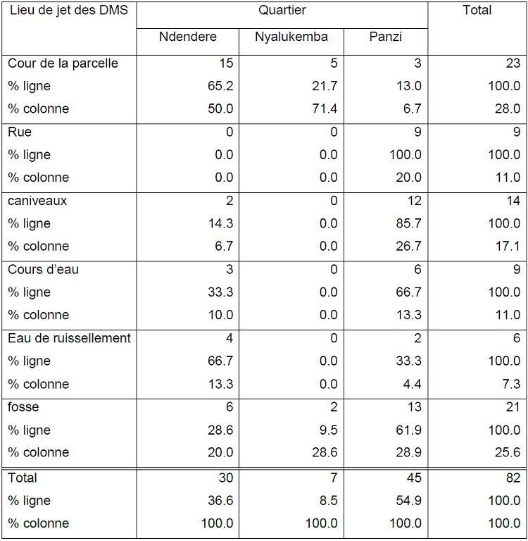Les familles qui ne disposent pas de poubelles, jettent les DMS dans l’environnement comme présenté dans le tableau suivant.