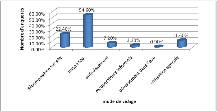 Ce mode de traitement de déchets dans les dépotoirs s’observe dans d’autres pays africains. En effet, Thompson (2010) a montré qu’au Ghana les déchets jetés dans les dépotoirs sauvages sont vidés par les récupérateurs informels et ou sont brulés par la population lorsque le volume devient important. SANA Congo (2010) a montré qu’à Brazzaville les dépotoirs ne sont pas vidés et pour éliminer les déchets, la population recourt soit à l’enfouissement et/ou au brûlage des déchets.