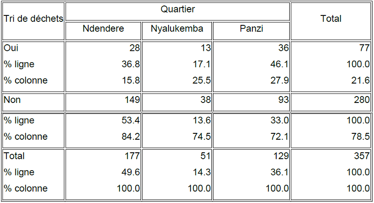 Au vu de ce tableau, nous avons remarqué que le tri des déchets ne dépend pas des quartiers (α=0,1167 > 0,05). Cette situation pourrait s’expliquer par le fait que les ménages de la commune d’Ibanda ne sont pas sensibilisés au système de stockage les DM. En effet, ces déchets ne sont pas préparés pour un traitement et valorisation éventuel qui pourrait pousser la population à trier les DM. La récente recherche menée dans la commune de Kadutu dans la ville de Bukavu a révélé que les DM ne sont pas triés (Abedi, 2012). Ce qui rejoint les résultats qui ont été obtenu dans la commune d’Ibanda.