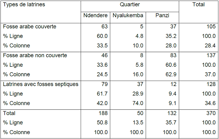 Il ressort de ce tableau que le type de latrines dépend hautement des quartiers (α=0,0000 ≤ 0,01) et que toutes les latrines de la commune d’Ibanda se perdent dans le sol soit directement ou indirectement à travers les fosses septiques. Les quartiers de la commune d’Ibanda n’ont pas les mêmes types de latrine. En effet, à Ndendere, les latrines sont soit à fosse septiques (42%) ou soit à fosses arabes couvertes (33,5%). A Nyalukemba, les latrines sont à fosses septiques (74%) alors qu’à Panzi, elles sont à fosses arabes non couvertes (62,9%). Ces résultats pourraient s’expliquer par le niveau de vie des ménages qui varie d’un quartier à l’autre dans la commune d’Ibanda. Les familles qui habitent autour du centre ville et dans le centre ville, ayant le niveau de vie élevé, possèdent des toilettes à fosses septiques (Ndendere et Nyalukemba par exemple). Cette situation s’observe aussi bien dans d’autres PED. La recherche réalisée par SANA Congo (2010) ont montré qu’à Brazzaville moins de 14,4% de ménages disposent des fosses septiques, moins de 28,6% des ménages des latrines à fosses étanches, moins de 42,4% utilisent des latrines traditionnelles et le reste des ménages se soulagent chez les voisins ou dans la nature. Dans la ville de Kigali, MINITERE (2002) a montré que 1% de ménages détiennent des latrines avec systèmes de réseau conventionnels à petit diamètre, 79% ont des latrines en fosse arabe et 20% des fosses septiques alors que Thompson (2010) a montré qu’au Ghana 30% des ménages seulement disposent des latrines. Ces auteurs ont montré que la nature des latrines dépend du niveau de vie des ménages. Les ménages riches possèdent des moyens pour se payer des bonnes installations hygiéniques ce qui n’est pas le cas pour les pauvres.