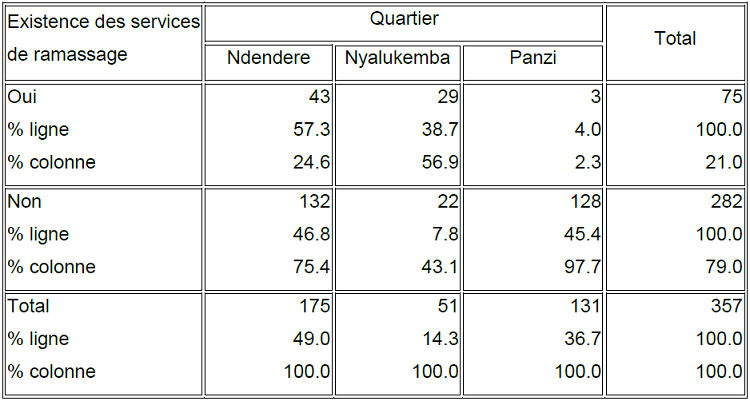 Il ressort de ce tableau que l’existence des services de ramassage des DMS dépend hautement des quartiers (α=0,0000 ≤ 0,01). En effet, les services de ramassage des déchets existent dans certains quartiers de la commune d’Ibanda et pas dans d’autres. Cette situation pourrait s’expliquer par le fait que les autorités urbaines ne s’impliquent pas dans le ramassage des déchets et dans la sensibilisation de la population. Elle pourrait aussi être due au niveau de vie de la population qui n’est pas le même dans tous les quartiers de la commune.
