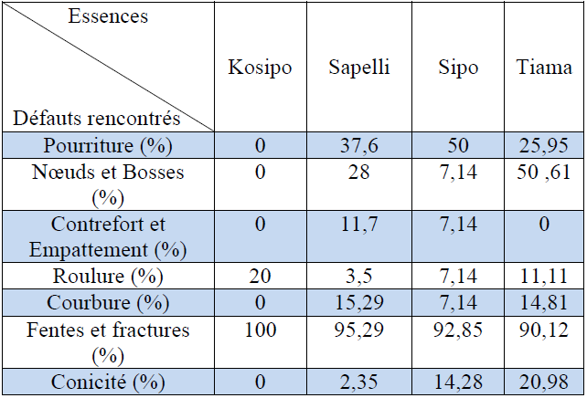 Nous avons identifié les cas de pourritures, noeuds et bosses, contreforts et empattements, roulure, courbure, fentes et fractures et enfin conicité. Dans le tableau 3 sont consignés les pourcentages des différents défauts identifiés sur les grumes de chaque essence.