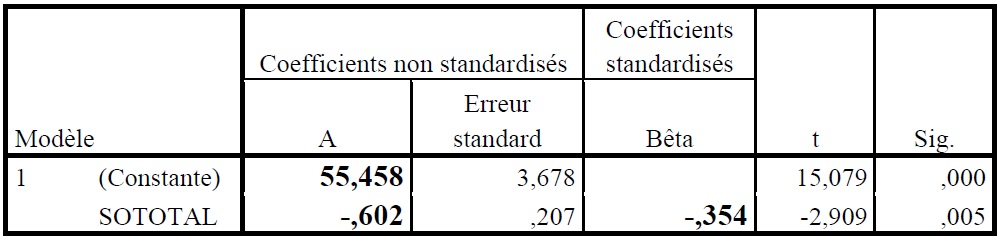 Enfin les coefficients non standardisés (A) précisent l’équation de la droite de régression « M = b0 + b1 X » soit « Stress perçu = 55,458 – 0,602 ».