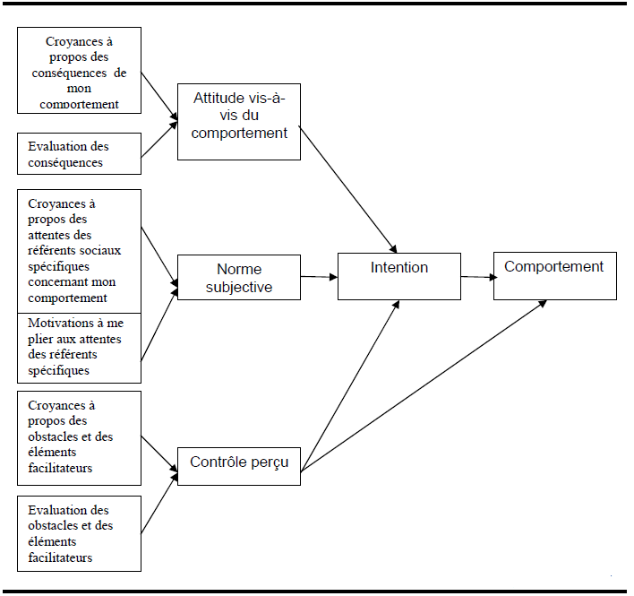 L’agrégat des trois éléments qui aboutissent à un comportement donné- à savoir les attitudes, les normes et le contrôle comportemental- est utilisé tel un prédicteur du comportement futur. (Antoine et Lelièvre, 2006)