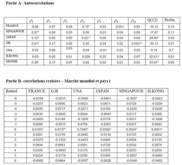 La lecture de ce tableau nous renseigne que les coefficients d’asymétrie sont majoritairement significativement négatifs, la distribution des séries est étalée vers la gauche, ce qui prouve que, dans la plupart du temps, l’effet d’un choc négatif est plus important que celui d’un choc positif. On remarque aussi le caractère leptokurtique des séries de rendements car le coefficient d’aplatissement centré est supérieur à trois pour toutes les séries. L’aplatissement excédentaire témoigne d’une forte occurrence des points extrêmes, donc une distribution à queues épaisses. En définitive, exception faite du Japon, l’hypothèse de la normalité est rejetée pour tous les marchés nationaux y compris le marché mondial comme l’illustre le test de Jaque et Berra. Ceci nous conforte dans l’estimation d’un modèle non linéaire et plus particulièrement d’un modèle de type GARCH multivarié asymétrique présenté plus haut qui permet de capter ces propriétés.
