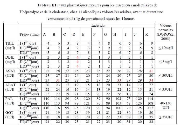 les taux plasmatiques de ces transaminases avant et durant une consommation de paracétamol.