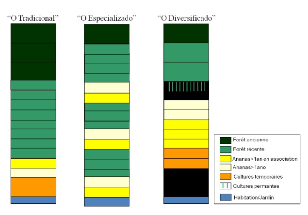 L’effort porte sur la recherche d’un coût de production faible. Ainsi, l’utilisation des intrants est en général très limitée. Le système comprend 2 ha de cultures temporaires (le maïs ou le riz, mais plus souvent le manioc), 1 ha d’ananas en association avec des cultures annuelles plantées l’année n et une autre plantée l’année n-1 non associée (la culture associée pourrait porter préjudice à l’ananas). La rotation sur la forêt secondaire s’effectue sur 5-6 ans et une partie de forêt, la moins exploitable (éloignement, reliefs…) est laissée hors culture. Elle constitue une réserve. Ce type est en général moins étendu que les deux autres et a des besoins plus réduits.