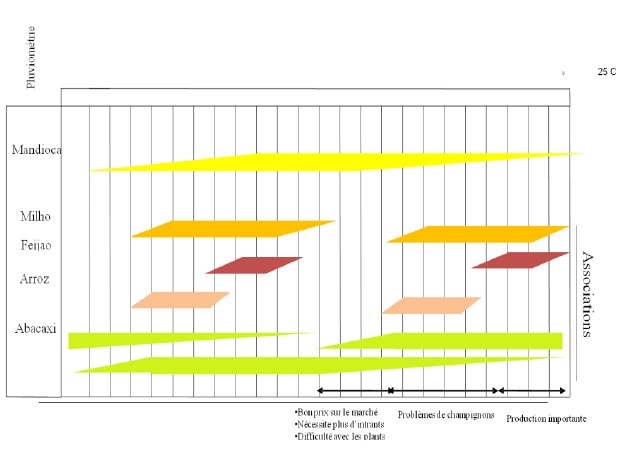 Le système de culture le plus répandu dans la région comprend deux cultures de manioc successives après abattis brûlis de 5-6 ans. Certains agriculteurs tendent à diminuer le temps de jachère, utiliser des engrais et même parfois, labourer de manière mécanisée. La monoculture de riz, en général destinée à l’autoconsommation, est encore assez commune, mais tend à diminuer. Le haricot est parfois planté en association avec le maïs et se sème en fin de saison des pluies pour pouvoir être récolté pendant la période sèche (figure 12).