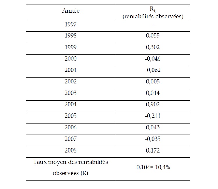 Tableau 1.10 : calcul du taux moyen des rentabilités observées sur le marché boursier tunisien