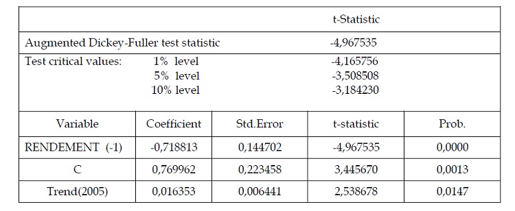 Tableau 2.1 : test de stationnarité de la série des rendements mensuels du marché : modèle avec tendance et constante « en niveau »