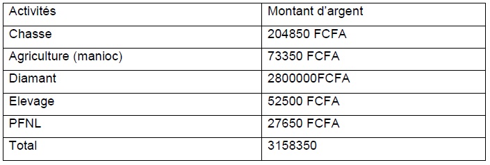 Les revenus présentés ci –hauts proviennent de traitement des informations collectées à partir du questionnaire sauf l’argent du diamant , qui est obtenu grâce à l’entretien.