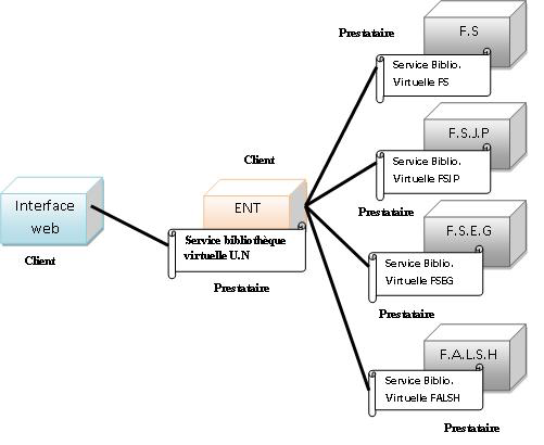 L’agrégation de services : Pour mieux comprendre cette notion d’agrégation de services, nous allons nous référer à un schéma d’exemple représentant le cas d’un service de bibliothèque virtuelle dans l’ENT de l’Université de Ngaoundéré, tout en sachant que chaque faculté dispose aussi d’une bibliothèque. Ce service de bibliothèque virtuelle est issue de la composition (ou de l’orchestration) des services atomiques (ici, service de bibliothèque virtuelle de chaque faculté). L’implémentation d’un service par agrégation d’autres services est inconnue du client qui utilise le service agrégeant. En e et, celui-ci ne connaît pas et n’a pas besoin de connaître l’éventuelle complexité de l’implémentation du service en ce qui concerne l’agrégation d’autres services. Du point de vue du client, le service agrégeant est un service atomique décrit de façon usuelle. En guise de rappel, l’agrégation de services peut se faire à l’aide des outils comme BPEL4WS (Business Process Evaluation for Web Service).