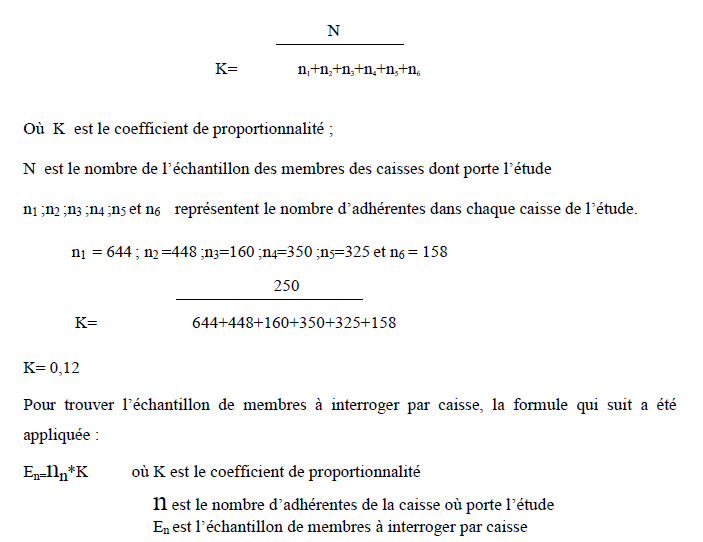 Au troisième degré, 250 membres ont été choisis de manière aléatoire dans les six caisses de l’étude en fonction du nombre d’adhérentes par caisse. C’est ainsi qu’un coefficient de proportionnalité K va être calculé et appliqué aux effectifs des femmes membres dans chaque caisse.