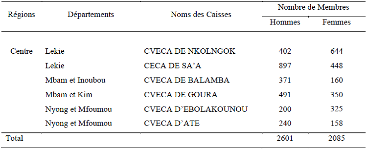 Au deuxième degré, un tirage aléatoire sans remise a été fait à partir de la liste des caisses du réseau A3C partenaires du PADMIR, ce qui a rendu possible la sélection de 6 caisses sur 22 à savoir : la CVECA de NKOLNGOK ; la CECA de SA’A ; la CVECA DE BALAMBA ; la CVECA de GOURA ; la CVECA d’EBOLAKOUNOU et la CVECA d’ATE. Une descente préliminaire dans celles-ci a permis de connaître le nombre de membres par caisse et c’est alors que le tableau 4 a pu être dressé.