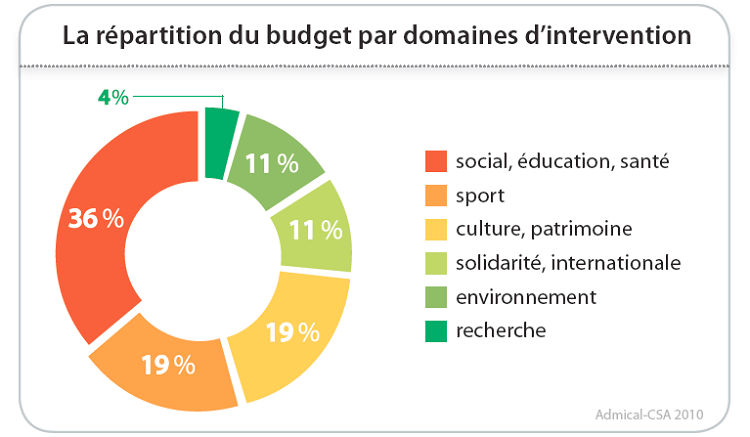 Ces chiffres sont tout de même à prendre avec précaution, car une modification de la nomenclature des différents champs a été effectuée entre les deux études, due justement à cet effet de porosité. Si la culture représentait un plus fort pourcentage, c’est aussi car dans l’enquête antérieure le champ social n’était pas aussi bien défini. Certaines actions qui relèvent du social en 2010, étaient classées dans la culture en 2008. Cependant, la régression est tout de même conséquente.