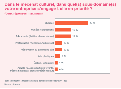 Les domaines de prédilection du mécénat culturel sont la musique, les musées/expositions et les arts vivants. La musique est un domaine où les entreprises s’investissent beaucoup, notamment en local à travers de nombreux festivals. C’est aussi un domaine plus simple, car il est universel et touche beaucoup de personnes. Les musées et expositions sont aussi très importants car les entreprises ont compris les enjeux du rayonnement et de l’attractivité d’un territoire. (ADMICAL, op.cit.).