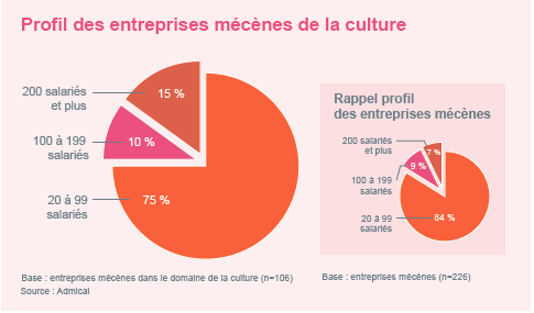 Enfin, les entreprises mécènes de la culture sont principalement des PME entre 20 et 99 salariés. Mais nous remarquons aussi que les grandes entreprises de 200 salariés et plus ont une part qui est plus importante dans le domaine de la culture que pour tous les domaines confondus (15% contre 7%). Les grandes entreprises sont donc particulièrement intéressées pas le mécénat culturel. (ADMICAL, op.cit.).