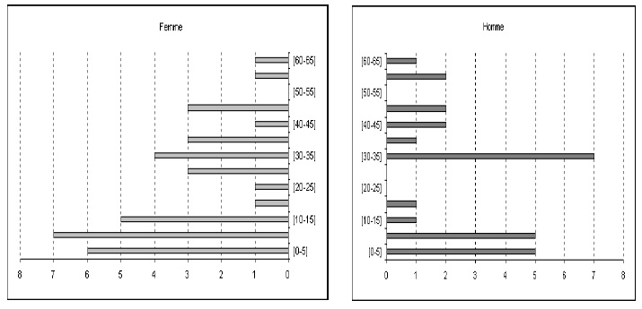 Pour bien examiner la répartition de la dite population ; nous avons établi la pyramide des âges de ces ménages (Figure N°..) où les 63 personnes de notre échantillon sont classées en fonction de leur âge et sexe.