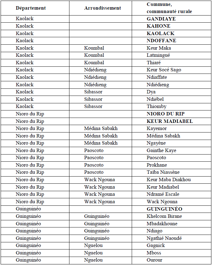 − 27 communautés rurales: Mbadakhoune (07), Kaolack (9) et Nioro du Rip (11).