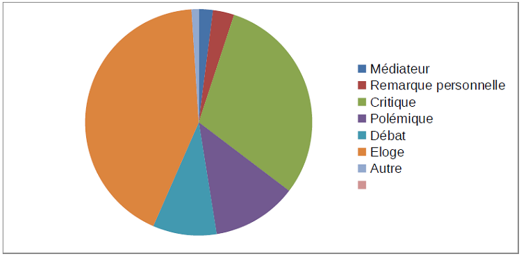 Sur l’ensemble des commentaires, la grande majorité sont des remarques élogieuses sur le webdocumentaire en question. Nous pouvons citer à titre d’exemple le commentaire de CD – à propos du webdoc Indépendance Chacha – : « Enfin un document multimédia de qualité, une forme qui devrait être plus présente sur internet ». Ce genre de commentaire élogieux est assez rare car peu d’éloge engage une réflexion sur le format et la diffusion du web-documentaire. La majorité de ce type de commentaire est du genre de celui de Marie-Sophie à propos de Berlon 1989, souvenirs d’un monde d’hier : « Excellent multimédia interactif ». A contrario, près d’un tiers constitue des critiques à l’encontre du web-documentaire. Nous avons constaté que trois types de critiques sont adressés : à propos de l’orthographe, de la manière dont est traité le sujet et par rapport au dispositif technique. Par exemple, Bibi Fricotin regrette que « cette interface [le webdoc sur François Duprat] soit inutilement sophistiquée et mal commode ». L’autre constat de notre analyse est l’absence de véritable débat. Il y a très peu de réponse à un commentaire. Parfois, deux ou trois individus se répondent mais ce phénomène est rare. Lorsqu’il existe, la polémique en est la source. Le terme ”débat” dans notre classification fait référence à un certain idéal du discours et de l’échange humain.