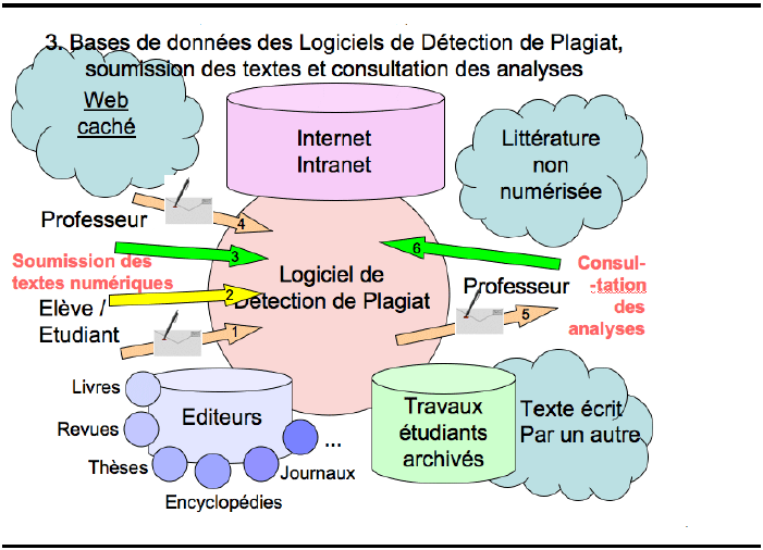 Autrement dit, lorsqu’un enseignant soumet le travail d’un étudiant pour vérification à l’un de ces logiciels, il est comparé aux travaux enregistrés dans les deux bases de données, et il en devient lui-même partie. En pratique « […] cela signifie que le travail en question sera comparé non seulement aux autres travaux soumis un peu de par le monde, mais aussi comparé aux documents soumis par les étudiants de la même classe ». (Note traduction) (Bothma et al., op.cit., p.127)