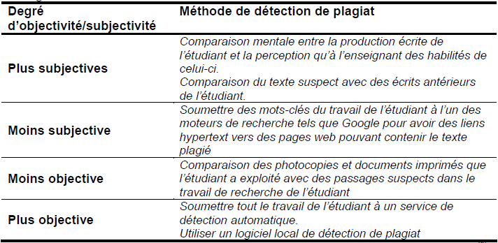Toutefois, un certain degré d’objectivité dans la vérification est atteint, en comparaison avec les anciennes méthodes instinctives de détection dont faisaient usage certains enseignants. Ci-après un tableau illustrant les méthodes qu’utilisent les enseignants pour vérifier les écrits de leurs étudiants, selon qu’elles soient subjectives ou objectives :