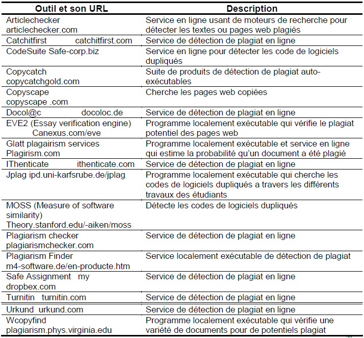 Tableau 3.1. Représentation des outils de détection de plagiat