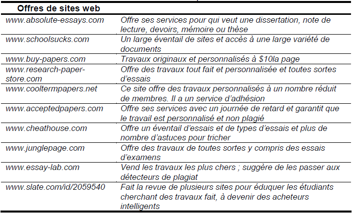 – Les sites vendant des travaux « clés en mains » ou sur mesure(40) ne leur sont pas accessibles. (Hannay, 2006, Bergadà, 2007) le plan de développement de ces sites, dont le commerce est fleurissant plus que jamais notamment dans le contexte nord-américain, canadien et européen, garantit les clients que leur produits résistent à l’épreuve du plagiat.