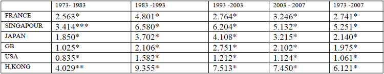 Le marché français quant à lui dégage des bénéfices moyens attendus de l’ordre de 2.741%. Il passe de 2.563% pour la sous période 1973-1983 à 4.801% pour l983-1993 pour redescendre ensuite à 2.764% pour 1993-2007. La corrélation conditionnelle du marché français avec le marché mondial est de 0.618% en moyenne. Soulignons que des caractéristiques relativement similaires sont observées pour le Japon et la Grande Bretagne.