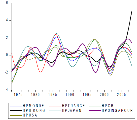 La figure 8 représente les séries des prix de risque de covariance filtrés par la technique d’Hodrik et Prescott (1996). Le prix estimé présente une tendance presque commune, ce qui est favorable à l’hypothèse de l’intégration financière des marchés analysés.