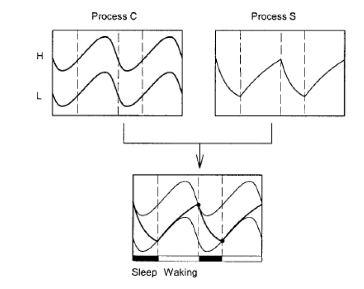Ce modèle se base sur l’interaction entre deux processus : le processus circadien (C) et le processus homéostatique (S) qui agissent en synchronie ou en opposition le long du cycle de 24h.