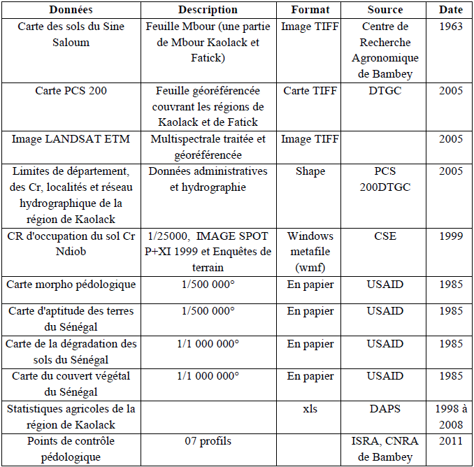 A ce niveau, la base de données cartographiques de l’étude Cartographie et Télédétection des Ressources de la République du Sénégal, Etude de la Géologie, de l’hydrologie, des sols de la végétation et des potentiels d’utilisation des sols et celle de la DTGC ont constitué une importante source d’informations.