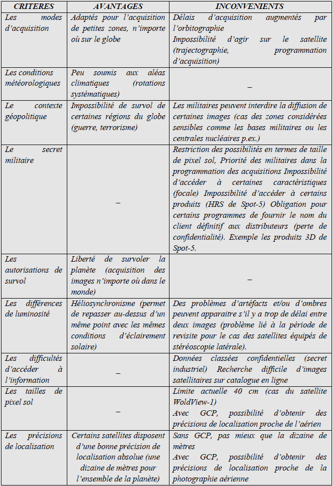 Le tableau ci-dessous montre les avantages et les inconvénients des images satellitaires