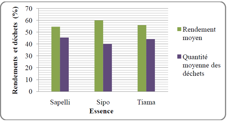 Quant aux déchets générés, le Sapelli a produit plus des déchets (45,45 %), suivi de Tiama (44,15 %) et puis le Sipo (40,08 %). Soit une production moyenne des déchets représentant 43,23 %.
