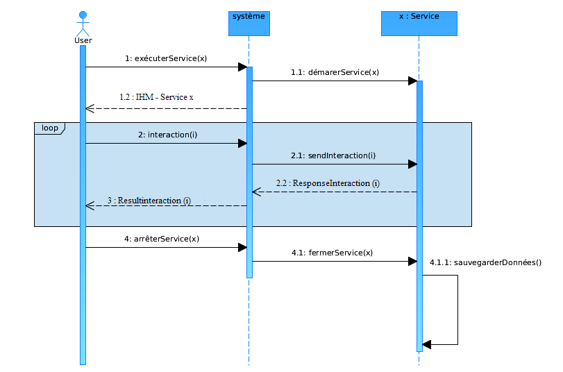 Nous pouvons aussi représenter les interactions entre les objets de la plateforme en indiquant la chronologie des échanges à travers un diagramme de séquence. Ce diagramme de séquence n’est qu’une autre modélisation de la plateforme de services proposée plus haut.