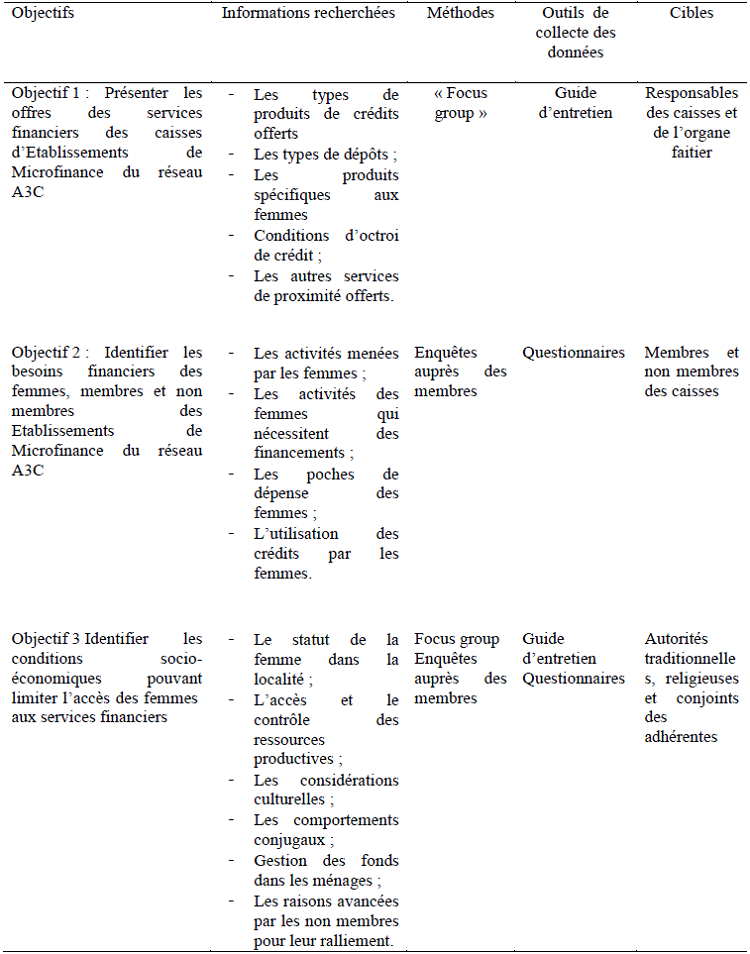 Les informations recherchées, la méthode de collecte des données, les outils utilisés et les différentes cibles pour la réalisation des objectifs de cette étude sont consignés dans le tableau 6.