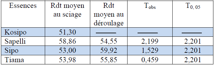 Le tableau 5 présente la comparaison des rendements (Rdt) moyens au sciage et au déroulage (production des placages humides) pour Sapelli, Sipo et Tiama.