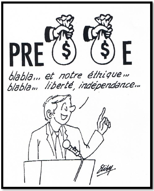 Un dessin satirique de l’artiste et journaliste Eliby (P-A. Lebonnois de son vrai nom) caricaturant les relations entre la presse et l’argent.