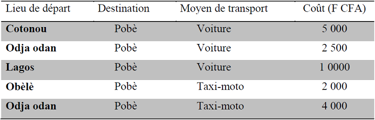 Pour assurer le transport des marchandises des lieux d’approvisionnement vers la commune les immigrants ont recours aux transporteurs locaux (chauffeurs, zemidjan, passeurs). En effet, le prix du transport des marchandises varie en fonction de la distance et de la quantité de la marchandise mais également du coût de l’essence. En matière de transport des marchandises en direction de la ville de Pobè, il existe un coût minimum sur lequel la majorité des transporteurs accordent leur violon.